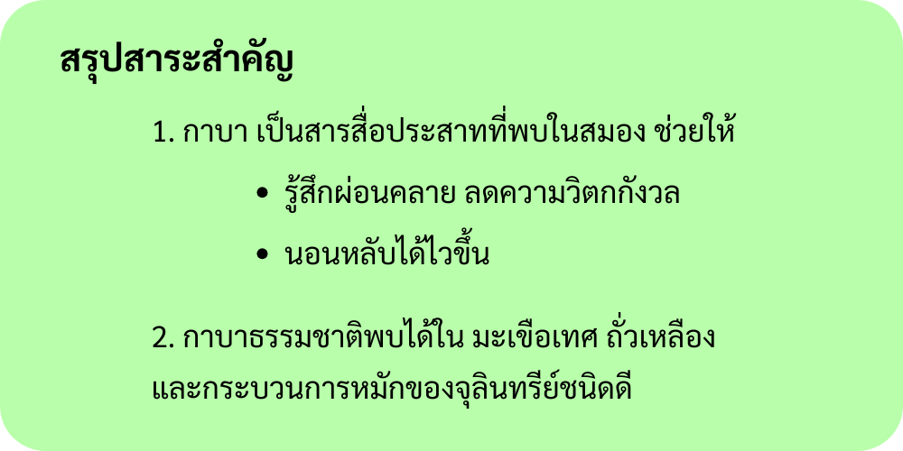 จากบทความจะเห็นว่า กาบามีประโยชน์ในการช่วยเพิ่มประสิทธิภาพในการนอนหลับ เพิ่มความผ่อนคลาย ลดความตึงเครียด และความวิตกกังวล การรับประทานผลิตภัณฑ์เสริมอาหารที่มีกาบาเป็นส่วนประกอบจึงเป็นอีกหนึ่งตัวช่วยในการนอนหลับของคุณ